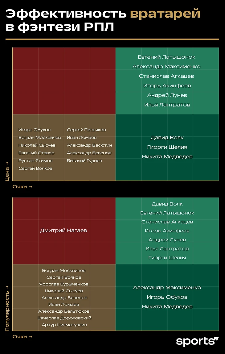 Евгений Латышонок (6; 48) – безошибочный вариант. Лидер по очкам, а по популярности уступает только Волку. Правда, в какой-то момент атака «Зенита», вероятно, снова станет более привлекательной, чем вратарь.
