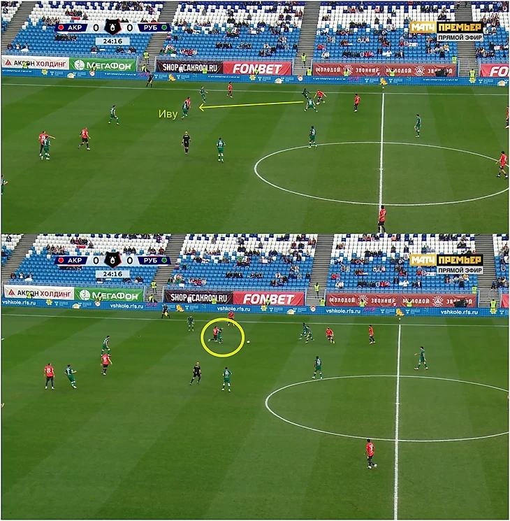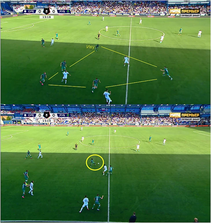 Еще выше зависимость от стиля Рашида Рахимова. Именно он подсвечивает достоинства Иву. «Рубин» компактный и старается максимально насыщать зону мяча, когда им владеет соперник. Иву грамотно поджимает к флангам, захлопывая ловушку и лишая варианта выйти через середину. Дальше – два пути. Первый – собирать киксы/неточные передачи.