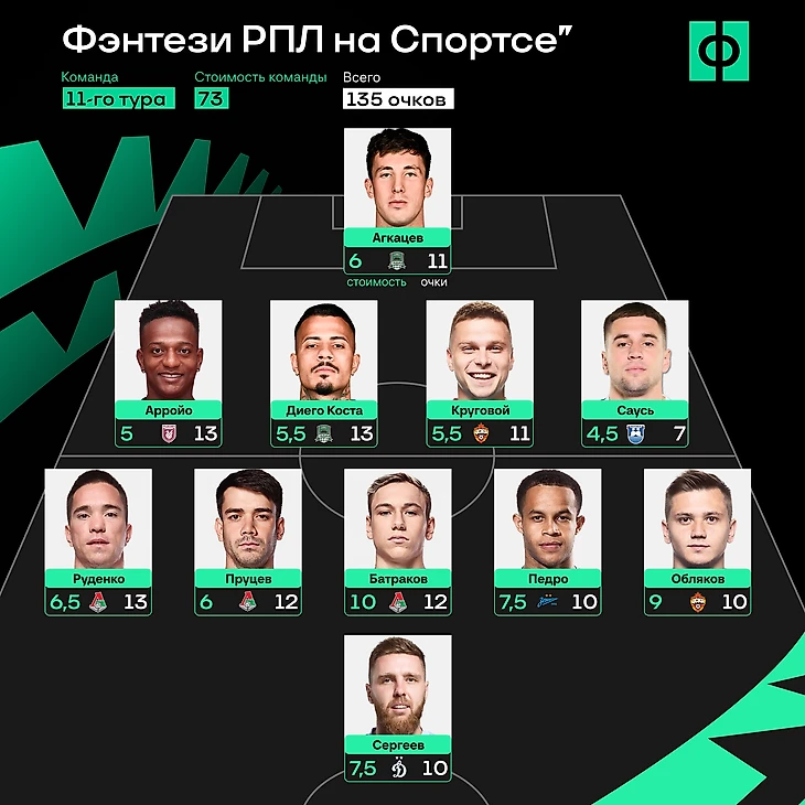 Перед вами сборная 11-го тура фэнтези-турнира по РПЛ: