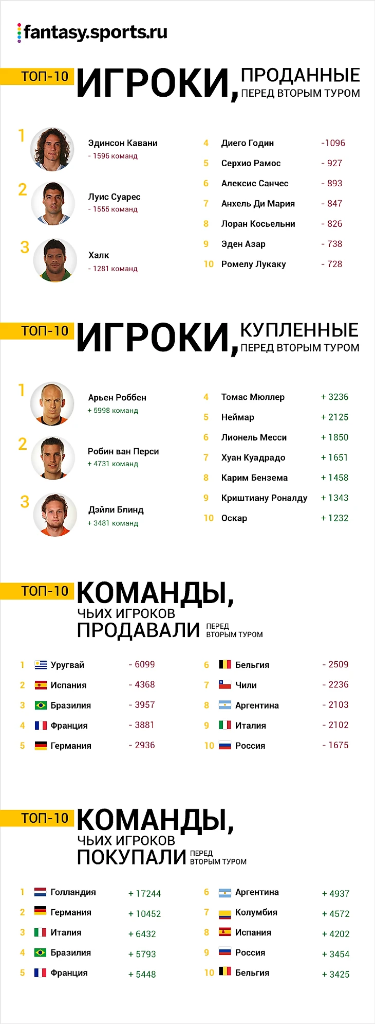 Инфографика Sports.ru показывает, кого покупают и продают игроки в фэнтези-футбол между первым и вторым туром ЧМ-2014.
