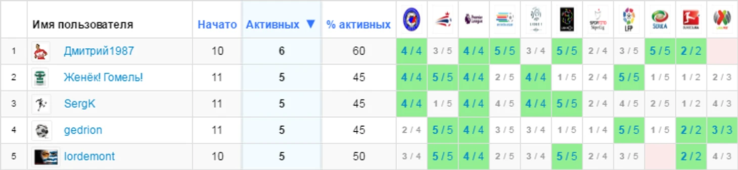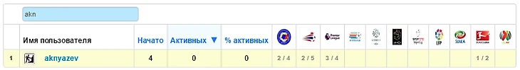 2) Также есть детализация по каждому турниру - зеленый фон означает активный турнир, красная и пустая клеточка - "не был заявлен"