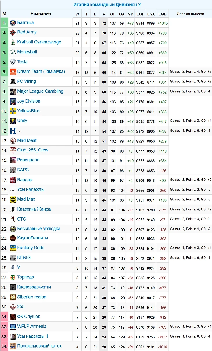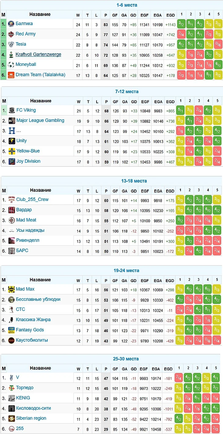 В первом этапе чемпионата участвовали 34 команды (рекорд нашей лиги!). Сначала каждая команда друг с другом по 1 матчу, после чего 4 худших команды отсеялись и борьбу продолжили оставшиеся 30. К вашему вниманию результаты первой части сезона: