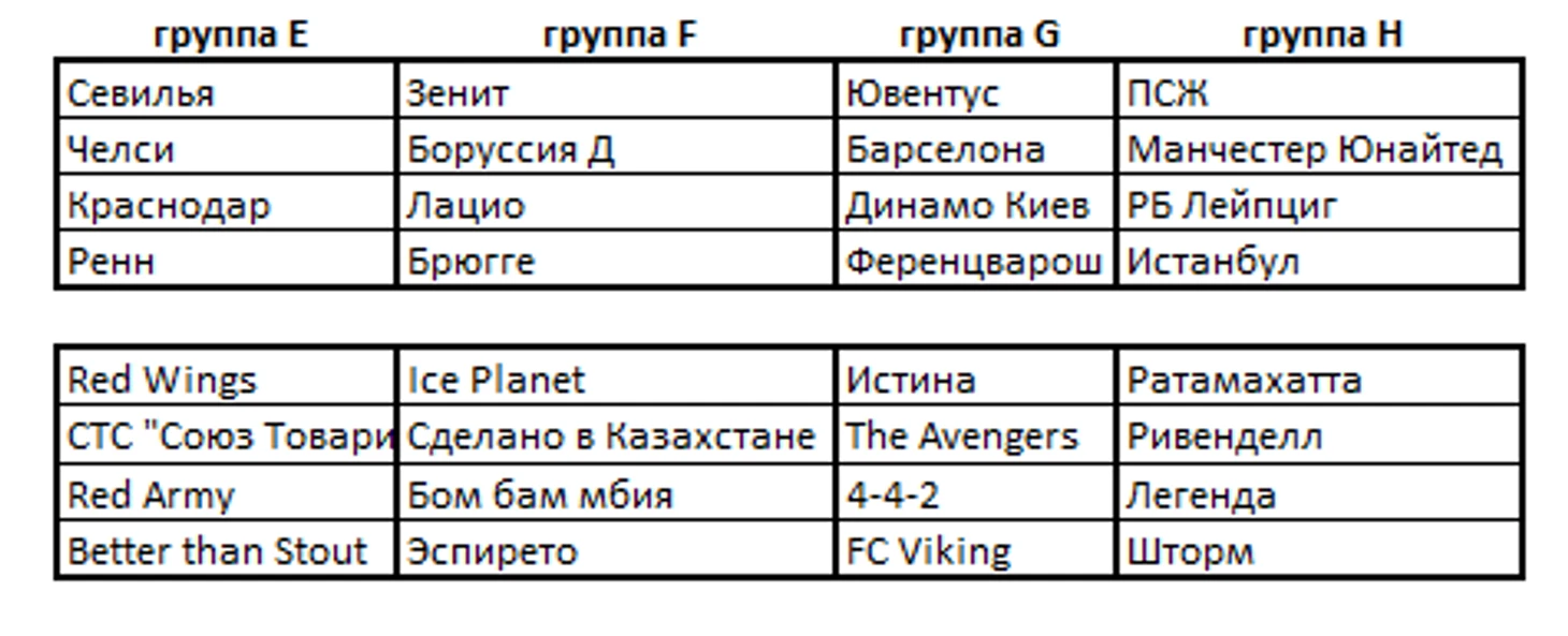 Воспользовавшись жеребьевкой реального турнира, составы групп у нас в H2H получились следующими: