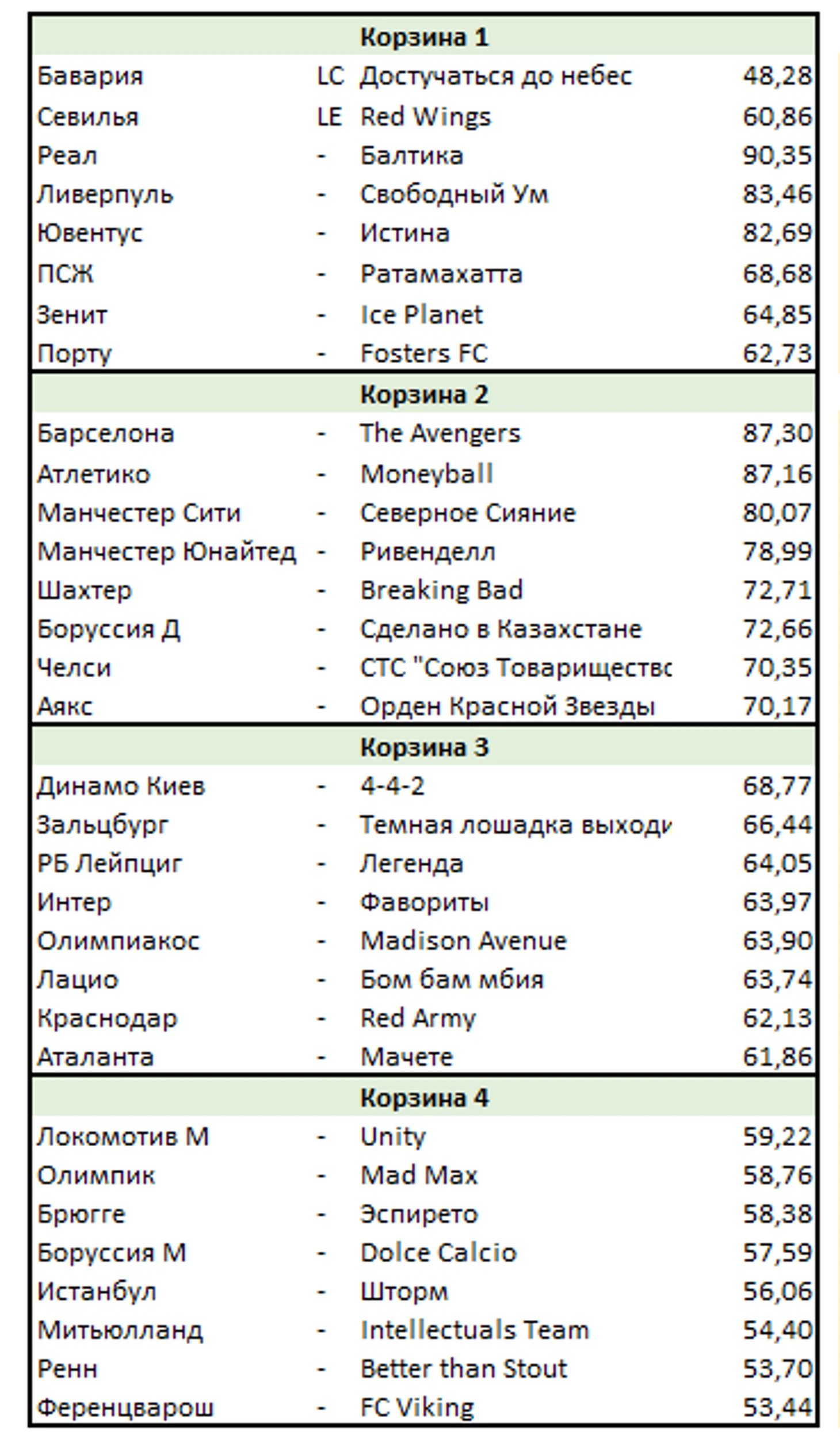 Корзина №1: победители Лиги Чемпионов и Лиги Европы, победители чемпионатов Англии, Испании, Германии, Италии, Франции, России и Португалии.В связи с тем, что Свободный Ум навыигрывал среди перечисленного много всего, по рейтингу в 1 корзину попала Балтика.