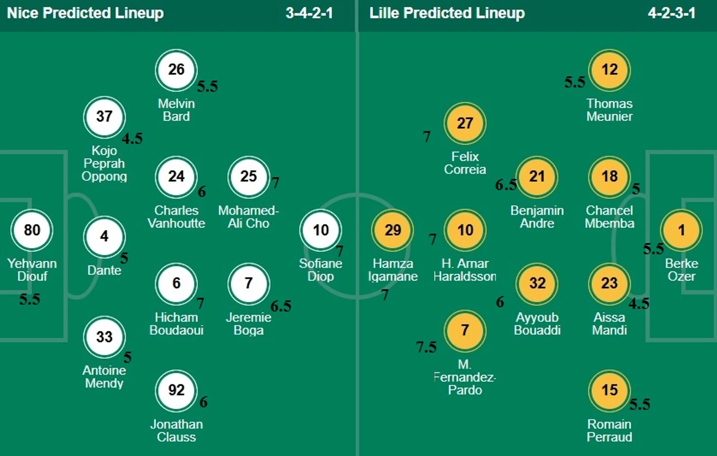 Ницца в прошлом туре победила во многом благодаря спасениям своего вратаря Диуфа (ВР, 5.5). В огненной форме у Ниццы находится Софьян Диоп (ПЗ, 7, 47 ФО) 5+1 в последних 4-х играх. Из игроков обороны наиболее активен в атаке Жонатан Клосс (ЗЩ, 6), 1+2, 16 ключевых передач, но кусается его стоимость, а также смущает травма, полученная в последней игре. В лидерах по атакующим действиям также хавбеки Бога (ПЗ, 6.5, 35 ФО) и Будауи (ПЗ, 7, 36 ФО). Форвард Мохамед Чо (Ницца, НП, 7, 16 ФО, 0+2) восстановился от травмы.