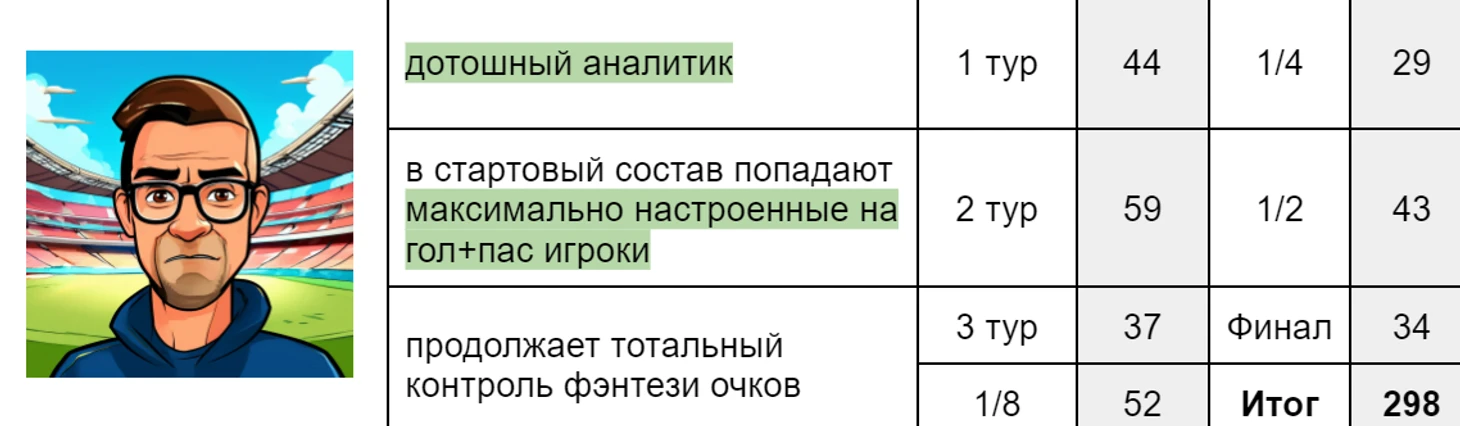 Менеджер №3 (14308 место из 29483). Независимо от итоговых результатов (которые он даже не видел) он рад эндшпилю и мияги, который ему удалось разыграть в финальной части турнира.