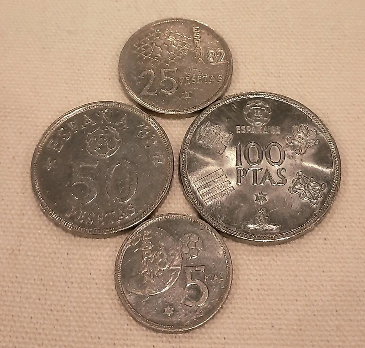 Всем привет, фарцовщик Зизу открывает дверь в нашу «Кладовку» и сегодня мы отправляемся в солнечную Испанию. С Пиренейского острова в нашу коллекцию попали 4 монеты разного номинала. Выпуск данных момент был приурочен к чемпионату мира 1982 года, который как Вы поняли принимали жаркие испанцы.