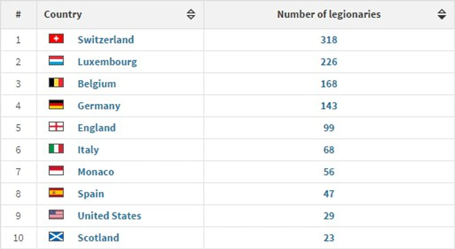 Предлагаю вашему вниманию первую десятку стран по количеству французских легионеров. Ожидаемо, в лидерах Бельгия и Швецария. Также в тройку входил Люксембург.