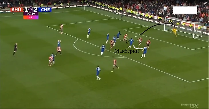 На 93-ей минуте происходит розыгрыш мяча от ворот «Шеффилд Юнайтед». Следует длинный заброс со своей половины поля от Джейдена Богла. В штрафной Макберни оказывается в отличном положении, где он забивает второй мяч и сравнивает счет (Рисунок 7).