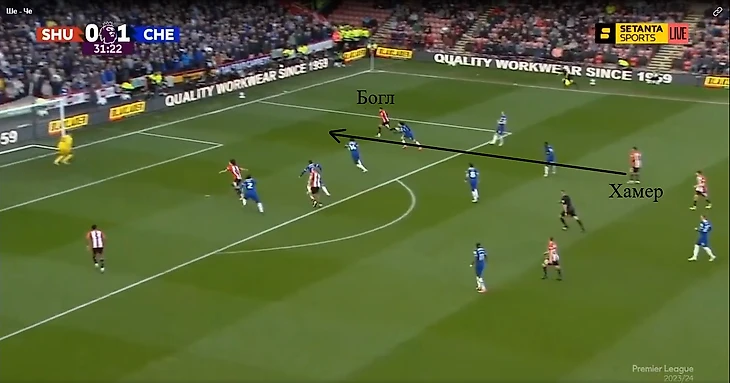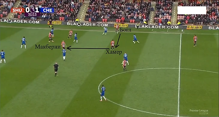 Наличие двух латералей - Джейдена Богла (20) и Остона Трасти (5) у «Шеффилд Юнайтед» позволяет растянуть оборону соперника. При обороне латерали препятствуют развитию атак противника и активно участвуют в собственных атаках. Подобная атака на 32-ой минуте через правый фланг от Джейдена Богла позволяет прорвать оборону «синих». Разрезающий пас от Хамера на поднявшегося в штрафную Богла позволяет сравнять счет (Рисунок 3-4).