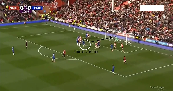 На 11-ой минуте «Челси» зарабатывает угловой. Конор Галлахер падает в центр штрафной. Защитник «синих» Тиаго Силва, воспользовавшись свободным пространством, бьёт в касание и открывает счет (Рисунок 2).