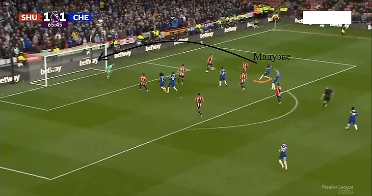 11-ый номер Нони Мадуэке получает мяч на правом фланге и опускается к штрафной, откуда следует удар в створ (Рисунок 6).