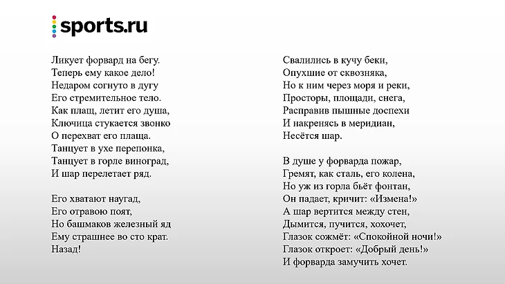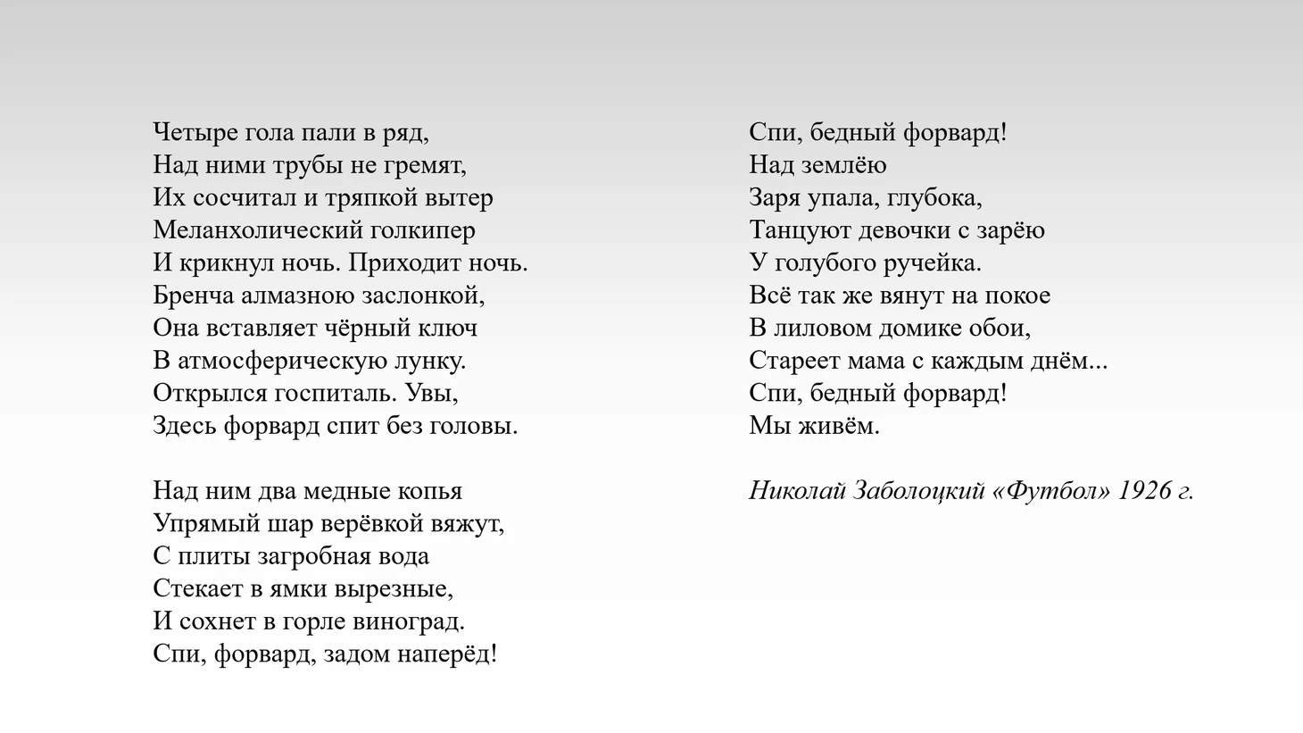О футболе писали многие. Кто-то, как Сергей Михалков или Владимир Высоцкий, относился к игре сатирически, видя в ней развлечение или детскую забаву, кто-то, как Саша Чёрный или Осип Мандельштам, наоборот, использовал футбол лишь в качестве детали, штриха, дополняющего образность стихотворения, очень отдалённо относящегося к спорту. Именно поэтому наше последнее стихотворение – «Футбол» Николая Заболоцкого. Здесь, безусловно, есть образность, и общая направленность кроется в чём-то большем, чем просто описание хода футбольного матча, но в то же время Заболоцкий сохранил чёткую привязанность к футболу реальному, воспринимая его как предмет, а не средство сравнения.