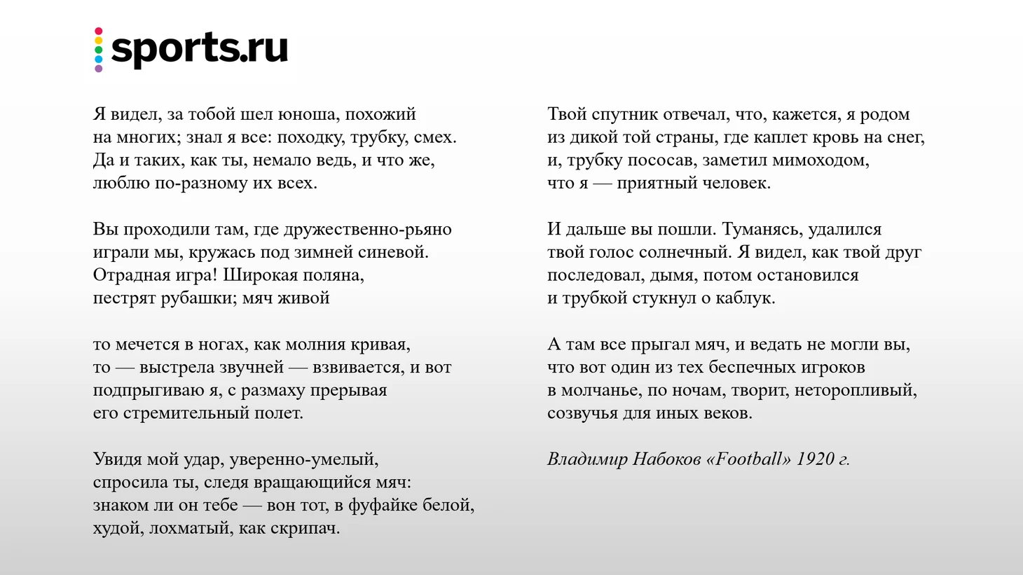 Известно, что Владимир Набоков трепетно относился к футболу. Он сам довольно часто играл (был вратарём, или голкиперствовал, как на английский манер он называл это занятие), и многих персонажей своих романов связывал с игрой. Вообще тема футбола красной нитью прошла через всю жизнь писателя. В 1970-м в одном из интервью он сказал: «Искусство — это изгнание. Ребенком в России я чувствовал себя чужим среди других детей. Я защищал ворота, когда мы играли в футбол, а все вратари — изгнанники» (подробнее – на Matchtv.ru). Написал Набоков и стихотворение о футболе, лирический герой которого, как и он сам, вратарь.