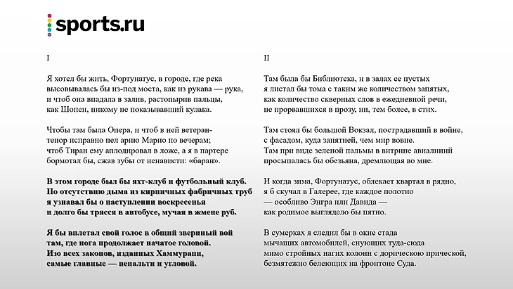Бродский любил футбол, об этом, в частности, рассказывал в прекрасном интервью «Сбг-блог 2» Геннадий Орлов, знавший Иосифа в свою бытность футболистом ленинградских «Зенита» и «Динамо». Поэтому вполне логично, что для великой игры нашлось место в его «идеальном городе». Но Бродский не был бы Бродским, если бы не сказал о футболе словами, которые врезались бы в память каждого, кто хоть раз их услышал. Фраза «изо всех законов, изданных Хаммурапи, самые главные – пенальти и угловой» уже достаточно давно стала культовой в футбольных кругах, а несколько месяцев назад бренд «Ничего Обычного», созданный братом Фёдора Чалова (другой мощной культурной отсылкой от Даниила и НО была форма «Витебска», посвященная супрематизму), выпустил лимитированную коллекцию, в которую вошли худи с цитатой поэта.