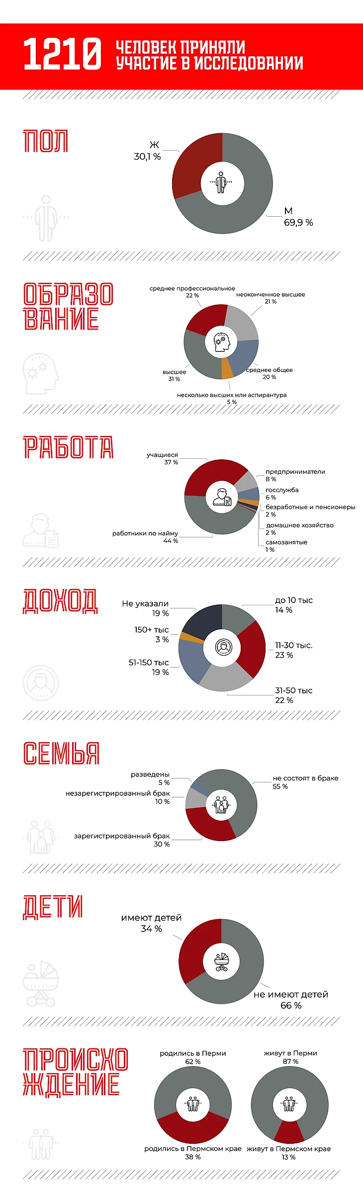 Исследование прошли 1210 человек — жители Перми и Пермского края: мужчины и женщины, студенты и пенсионеры, предприниматели и рабочие. В этом тексте — краткие выводы исследования, которыми мы можем поделиться публично.