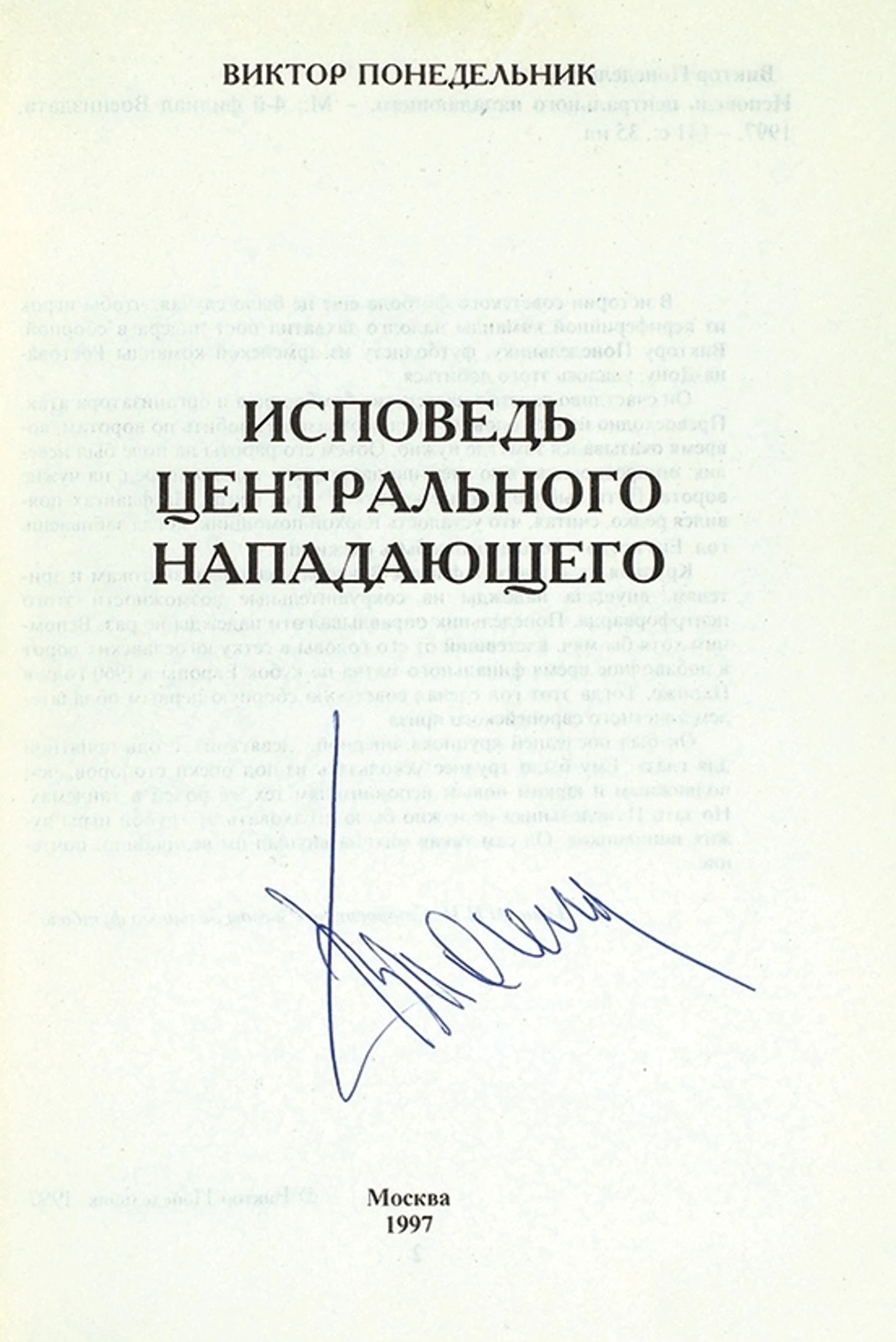 Виктор Владимирович пообещал мне подарить свою книгу. Слово сдержал. В 1997 году он снова посетил Калининград, где презентовал издание «Исповедь центрального нападающего». Мне вручил со своим дарственным автографом. Спустя несколько лет эту книгу я поменял на какую-то редкую программку «Балтики», о чем сейчас, конечно, жалею… Виктор Владимирович Понедельник. Звезда отечественного футбола. Пусть земля ему будет пухом…