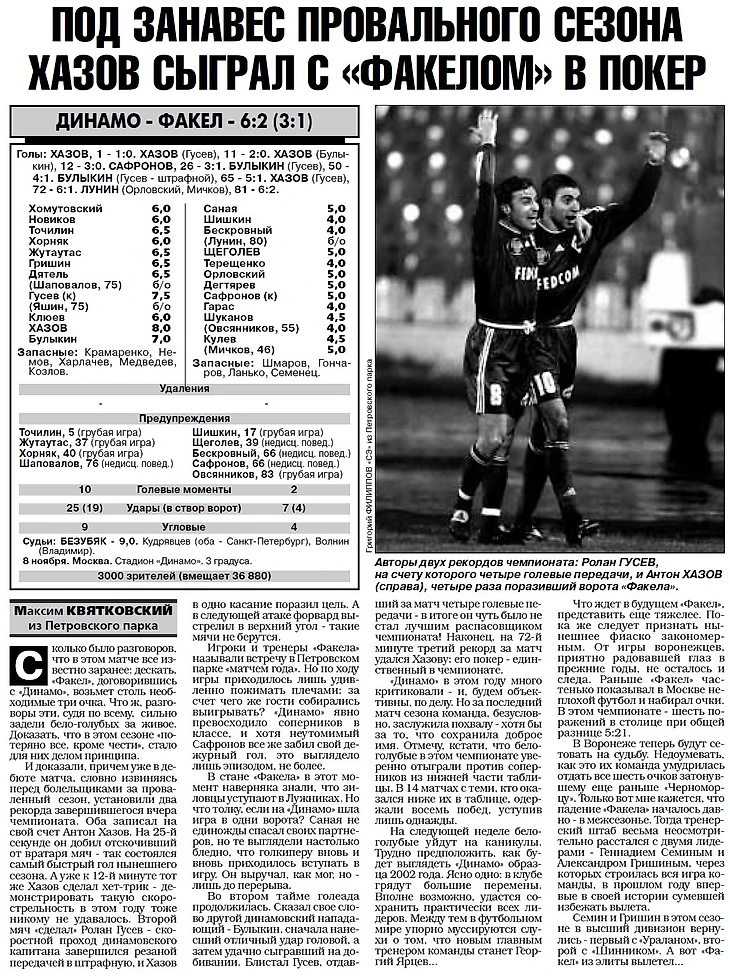 В Москве на легендарной арене в Петровском парке «Факел» полностью переиграл «Динамо». Савик Шустер на НТВ сравнил «Факел» с испанской «Валенсией». На мой взгляд, лучший по качеству игры выездной матч в исполнении команды Нененко. Красивые кружевные комбинации, «спартаковские» стеночки и забегания, бенефис Игоря Захарова на правом фланге. В центре поля Сёмин играл, как Бог. Раз за разом своими умными пасами-конфетками словно ножом масло разрезал оборону бело-голубых. Эх, если бы не два шальных, абсолютно нелогичных гола Ролана Гусева, не унести динамовцам ноги! Так близка была первая в истории победа в Москве в высшей лиге!