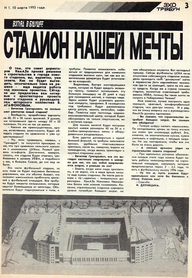 Но уже тогда было понятно, что городу требовался новый, более вместительный и современный стадион. И работа в этом направлении активно велась. В Набережные Челны был приглашен Вячеслав Агафонов, который стал архитектором проекта нового стадиона и руководителем авторского коллектива. Концепция и макет будущего стадиона были готовы к началу 1993 года.