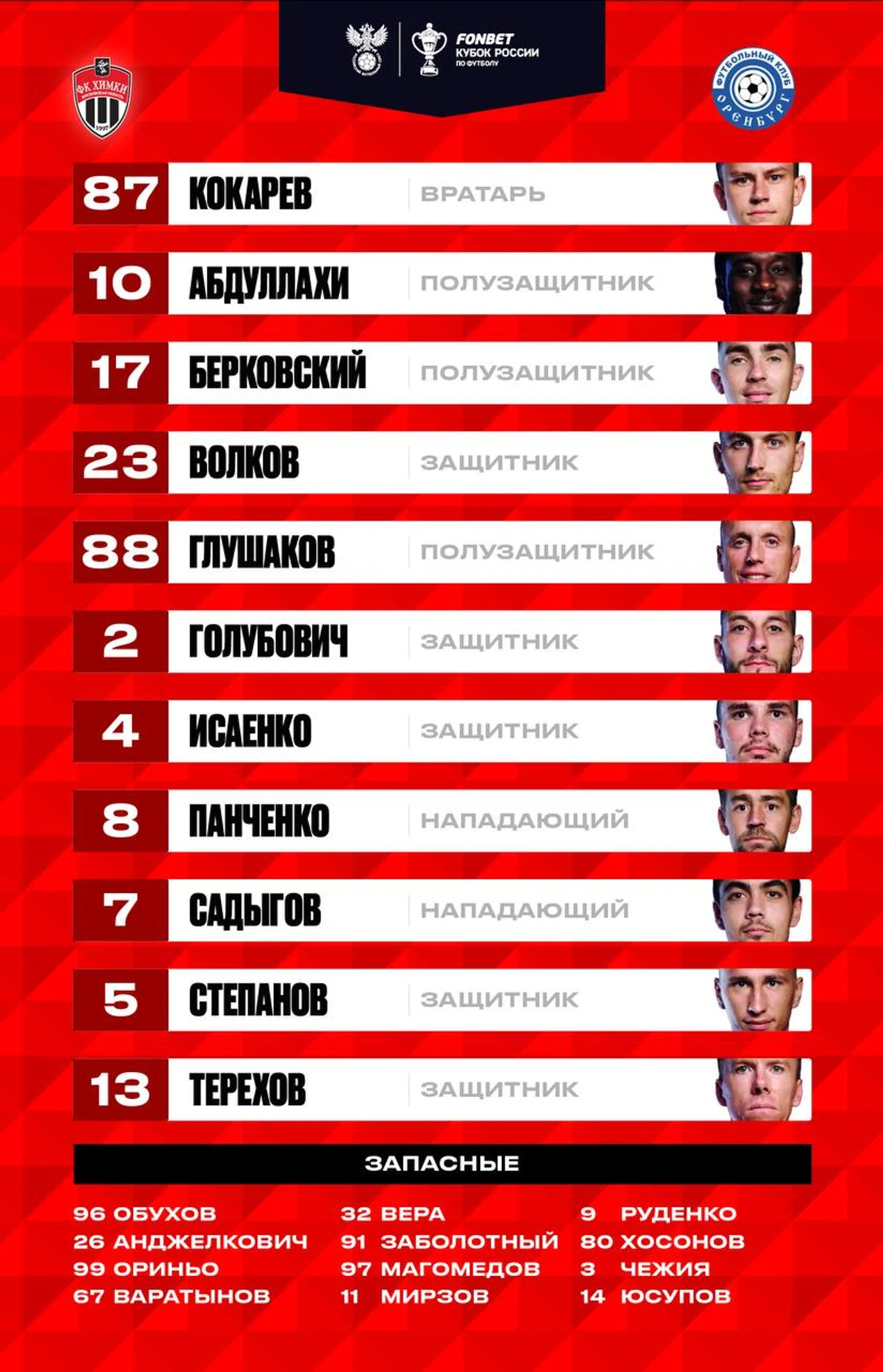 После двух туров РПЛ стартовый состав «Химок» на матч кубка ожидаемо претерпел изменения. Главный тренер команды Франк Артига выпустил на поле футболистов, которые не были задействованы в предыдущих встречах. Единственными игроками, выходившими в старте в первых двух турах РПЛ, стали защитники Петар Голубович и Сергей Терехов.