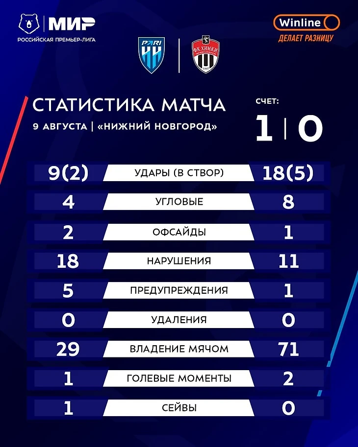 — «Пари НН» одерживает вторую победу подряд и набирает 6 очков в турнирной таблице РПЛ с разницей мячей --3. — «Химки» остаются с 4 баллами и теряют шестую строчку таблицы. Разница забитых мячей команды Франка Артиги составляет --2. — «Пари НН» увеличивает число побед в очных противостояниях против «Химок». Теперь на счету нижегородцев 8 побед в 13 матчах. — «Красно-черные» впервые в сезоне не сумели поразить ворота противника. В каждом матче сезона «Химки» забивали минимум один мяч. — Эдгардо Фаринья становится одним из самых успешных дебютантов в истории «Химок». За два матча средняя оценка панамского защитника составляет 7,7.