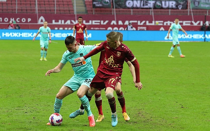 С такой расстановкой даже странным показалось, что рубиновые как-то сначала стеснялись дома давить на «быков». Тактическая перепасовка между Якимовым, Газинским и кем-то из ЦЗ порой казалась даже вальяжной, настолько ей не препятствовал буквально никто. В какой-то момент казанцы начали накрывать и очень своеобразно атаковать (вполне способный футболист Бакаев чаще всего «Краснодара» бил по нашим воротам. Но получалось при этом у него так, будто в этой статистике и была самоцель), благо их усилиям не хватало организованности. Вообще, хочется как-то подбодрить такого хорошего человека как Леонид Викторович, признаем: временами фланг Самошникова и Зотова был неплох, но при этом как-то спокойно, по ФНЛ-буднично Газинский и Бородин эти атаки (ура!) прерывали.