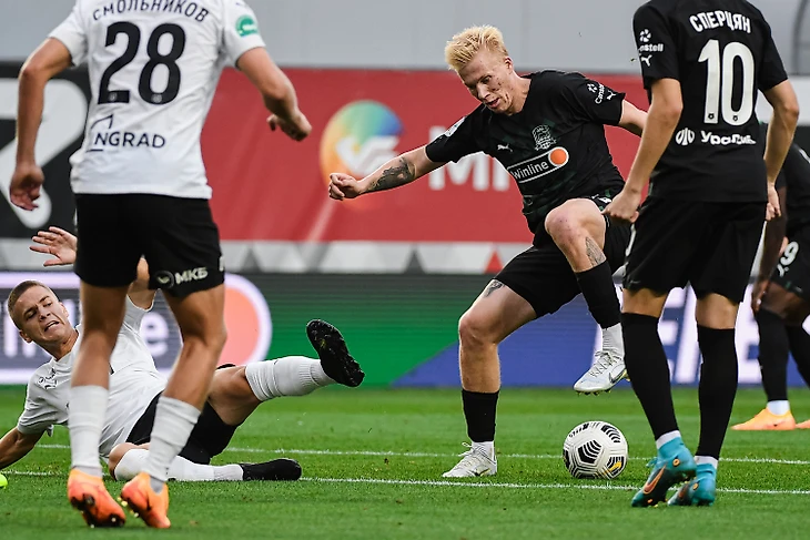 Никита с каждой игрой всё более основательно занимает место плеймейкера таранного типа, сочетая физическую мощь (у кого-то получилось оттереть его от мяча?) с отличным «первым» пасом. Лучше всего у него удаются диагонали на Ионова, Рамиреса, Олусегуна, но замысловато отыграться накоротке либо отдать в касание на ход он тоже способен. Никита тот удивительный игрок, которому нужно а) доверять б) не мешать, что, видимо, осознает и Александр Александрович. В такой ситуации отнюдь не бездарный Баянц становится жертвой скамейки и обстоятельств: мало кто перед стартом сезона мог ожидать такой прыти от такого необычного игрока.
