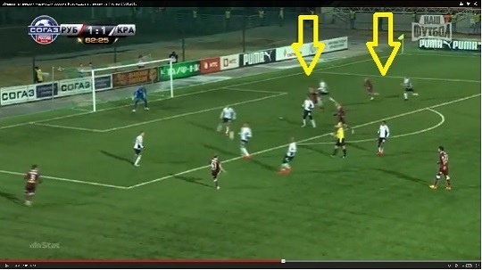 Получается, здесь поздно отреагировали на ситуации именно левый и левый центральные защитники. Они не успели перестроиться. Это хорошо видно и в момент подачи Карадениза, когда оба краснодарца не успевают за соперниками.