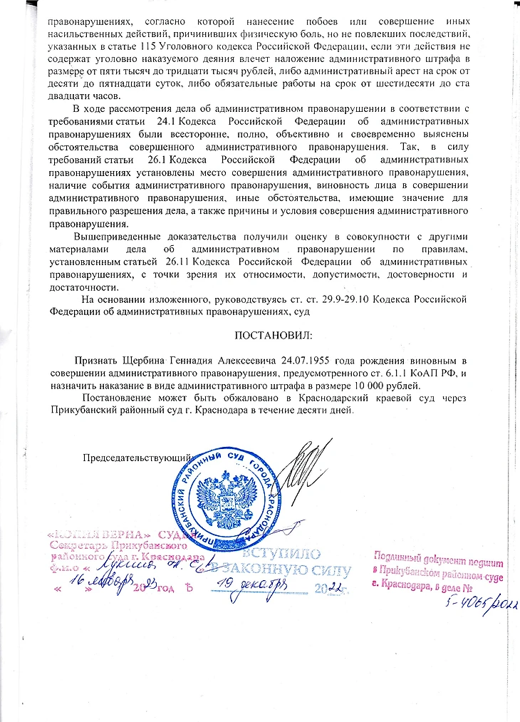 Решение Прикубанского районного суда г. Краснодара о признании сотрудника ФК «Краснодар» Геннадия Щербины виновным в совершении административного правонарушения, предусмотренного статьей 6.1.1 КоАП РФ «Побои», вступило в законную силу. Придется ему выплачивать штрафы государству и за то, что 26 сентября 2021 года во время матча побил колясочницу Татьяну Шкиря (дело № 5-4065/2022), и за неповиновение законным требованиям сотрудников полиции (дело № 5-1101/2022 в в Первомайском районном суде г. Краснодара).