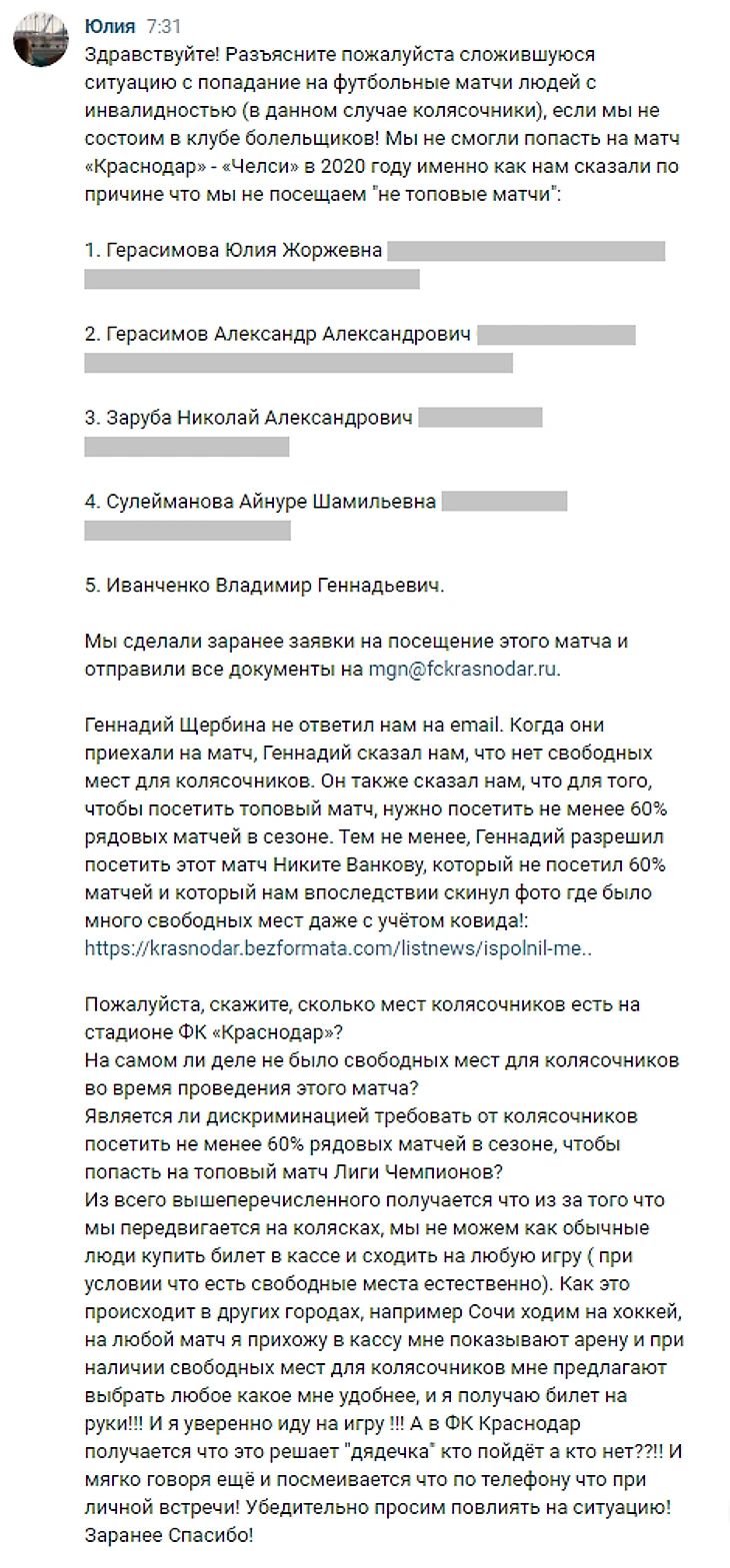 10 сентября 2021 года Юлия Герасимова, которая проживает в г.Анапа, отправила письмо Георгию Безбедову на email g.bezbedov@fckrasnodar.ru, в котором она спросила: «Сколько мест для колясочников есть на стадионе ФК «Краснодар»? На самом ли деле не было свободных мест для колясочников во время проведения матча 28.10.2020»?