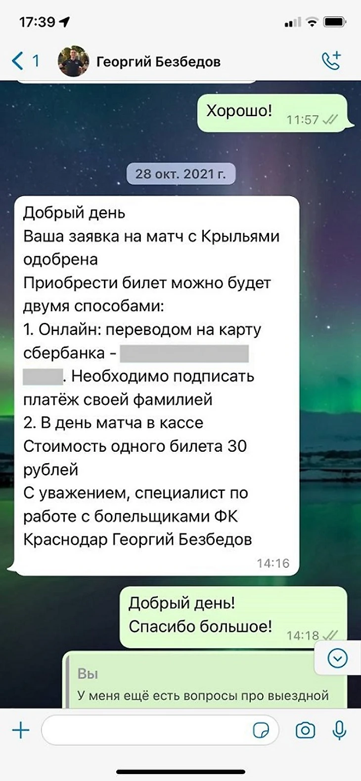 30 октября 2021 года Игорь приобрел билет на место в верхнем ряду сектора 117 переводом на личную банковскую карту Безбедова. После оплаты Игорь получил билет в электронном виде в WhatsApp от Безбедова, но чек о покупке билета от агента ООО «Инвестстрой» и поставщика ООО «Футбольный клуб «Краснодар» ему не предоставили.