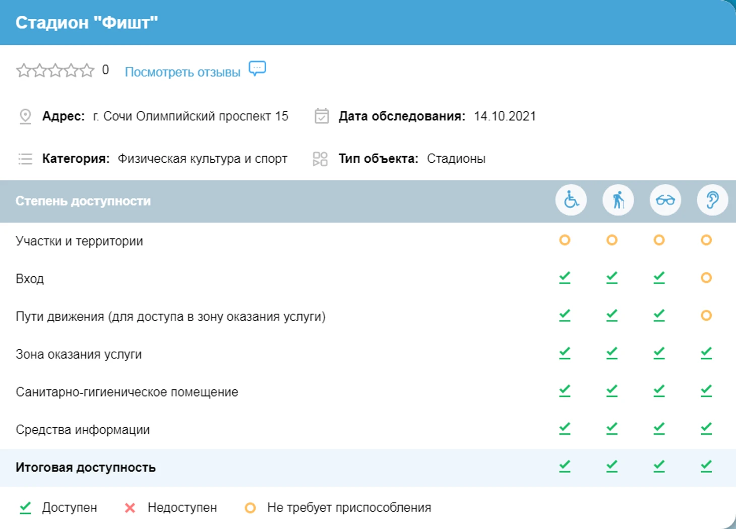 Информация о доступности стадиона «Фишт» опубликована в разделе «Карта доступности социальных объектов» сайта «Доступная среда» https://zhit-vmeste.ru/map, субъект РФ: Краснодарский край https://portalds.krasnodar.ru.