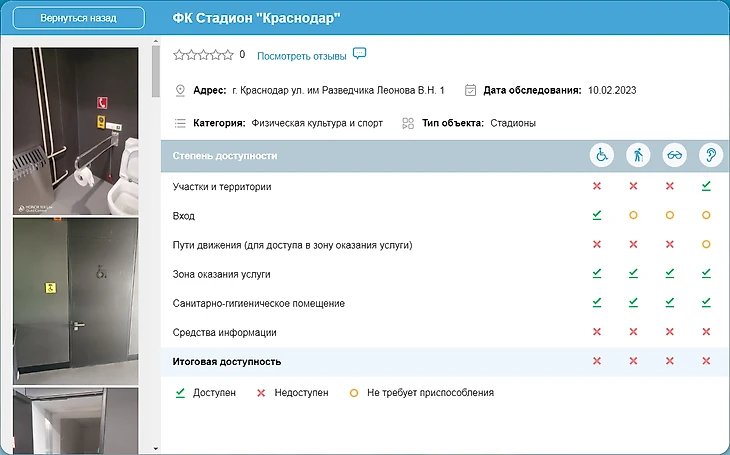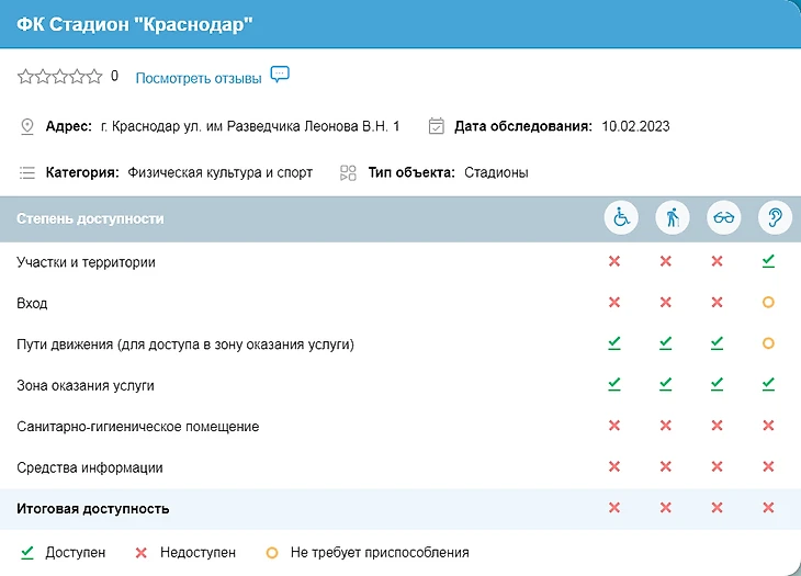По результатам мониторинга от 10 февраля 2023 г. установлено, что стадион ФК «Краснодар» не в полной мере соответствует Своду правил СП 59.13330.2020 «Доступность зданий и сооружений для маломобильных групп населения. Актуализированная редакция СНиП 35-01-2001».