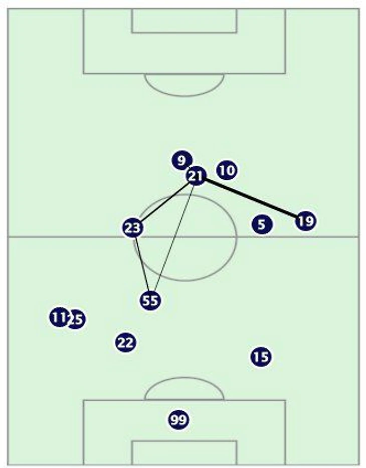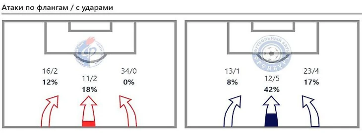 5) Заметен крен атак обеих команд на правый фланг. Это видно и по колоссальной разнице позиций Эктова и Стаматова. Главной фигурой взаимодействий стал Флорентин. Атакующая тройка "Оренбурга" сбилась в одну точку.