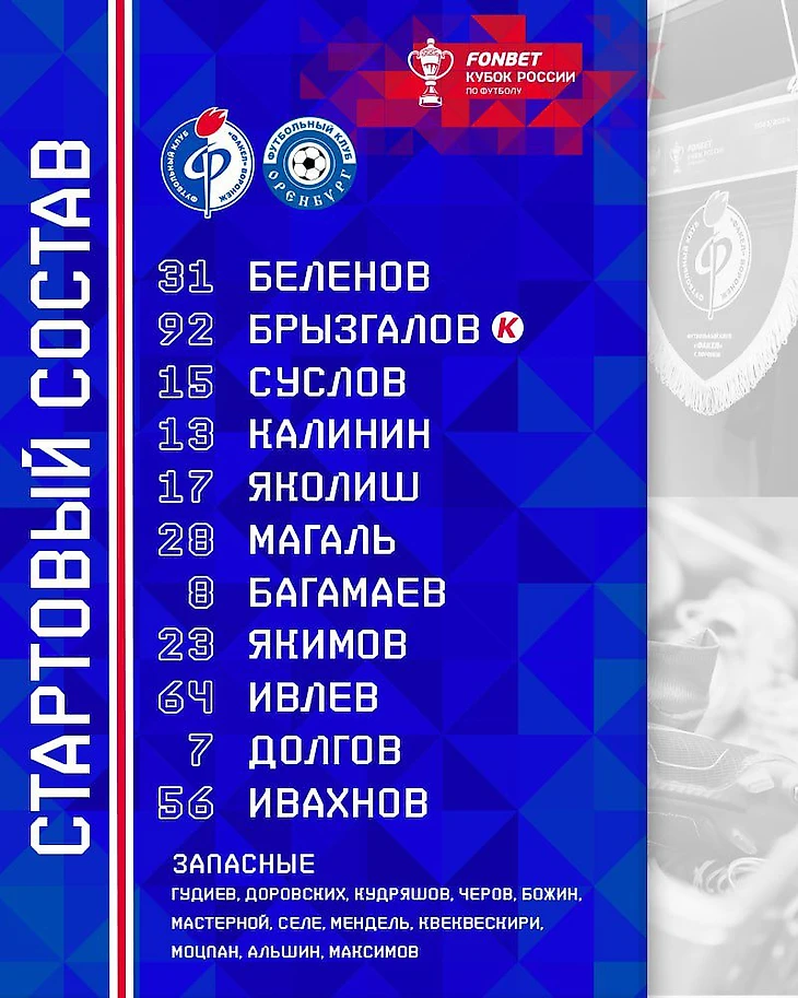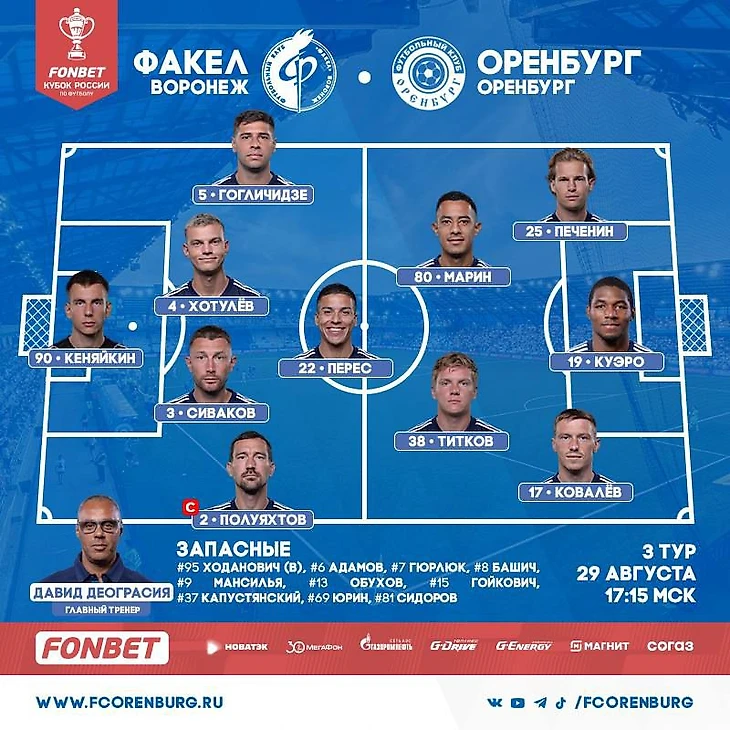 Обе команды выставляют вторые составы. У "Оренбурга" даже в зявке нет Веры и Оганесяна. На схеме Перес - опорник, Марин в центре, Печенин в атаке. Посмотрим, так ли это.