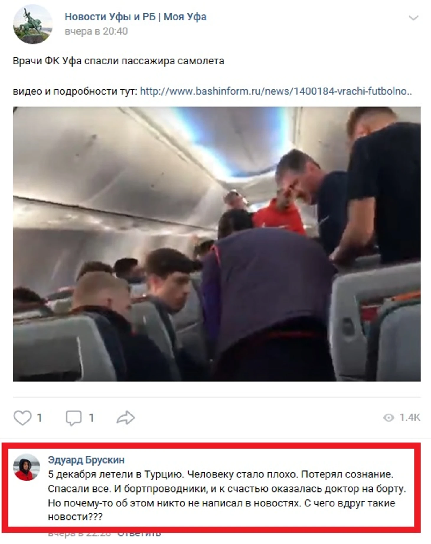 Вкратце напомним цепь событий. Вечером 12 января футбольный клуб «Уфа» загрузился в самолет и вылетел на Кипр к месту первого сбора. Вскоре после взлета одному из пассажиров стало плохо. На счастье, в самолете оказались медики ФК «Уфа», а самое главное вездесущий пресс-атташе клуба, который не растерялся и быстро превратил несчастный случай в своеобразную пиар-компанию