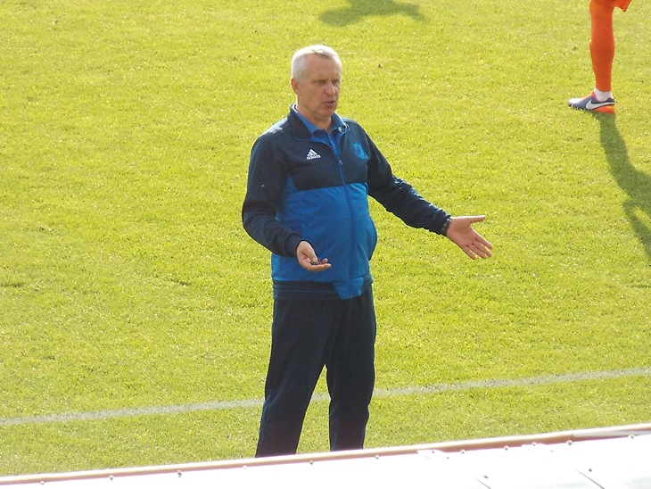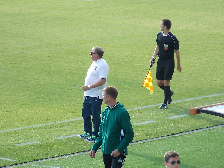 Леонид Кучук в 36-й раз поворачивается к своей скамейке с характерным жестом. На этот раз он недоволен офсайдом.