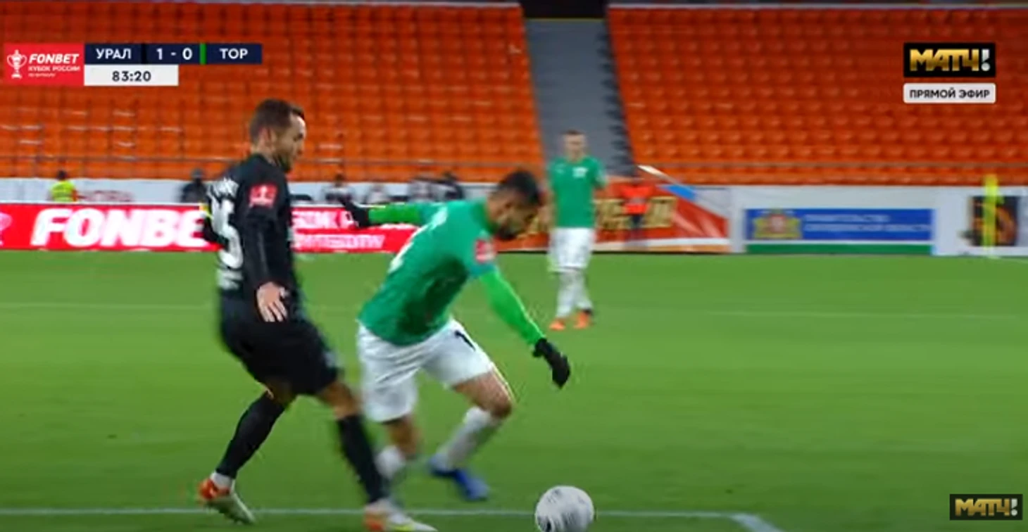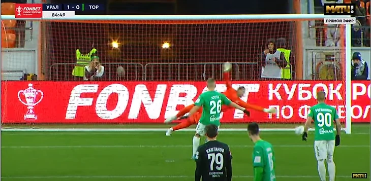 Так играли заключительные 10 минут. Но на первой из них, пока перестраивались, попались на фоле в штрафной. Кулаков, конечно, не собирался косить Султонова, тот грамотно нашел выставленную ногу ,но факт остается фактом - касание было, до мяча при этом Денис не добрался.