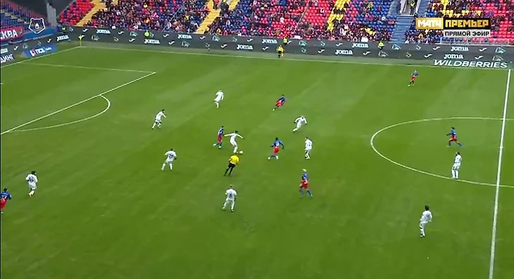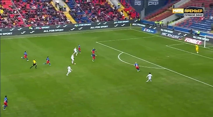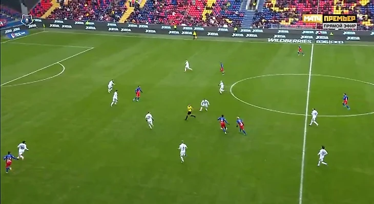 Рафал отдаёт на Магомадова, Медина продолжает прессинговать по мячу. При этом Гбамен не делает движения в центр, чтобы подстраховать партнёра.
