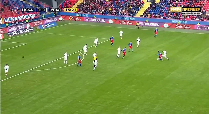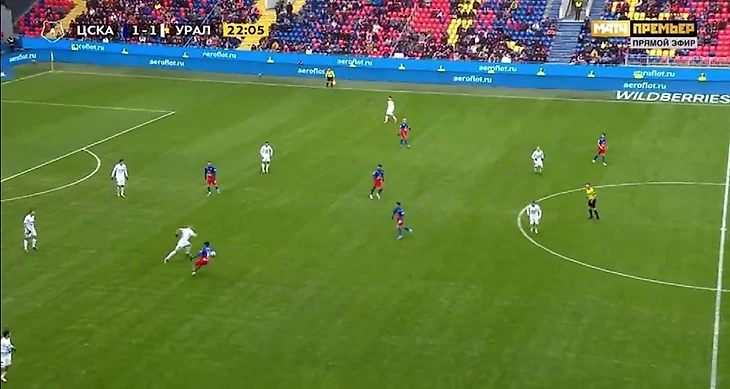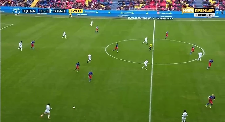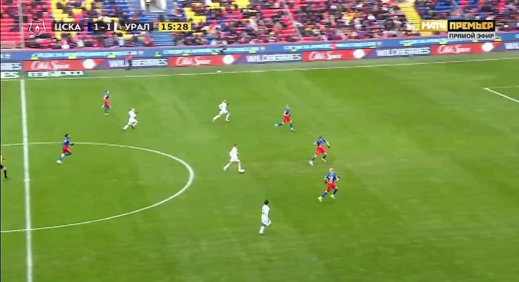 А вот Бикфалви удаётся обокрасть Гбамена на своей половине поля. Тройка центральных защитников ЦСКА снова остаётся изолированной. Тут же следует контратака, в которой «Урал» создаёт численный перевес.