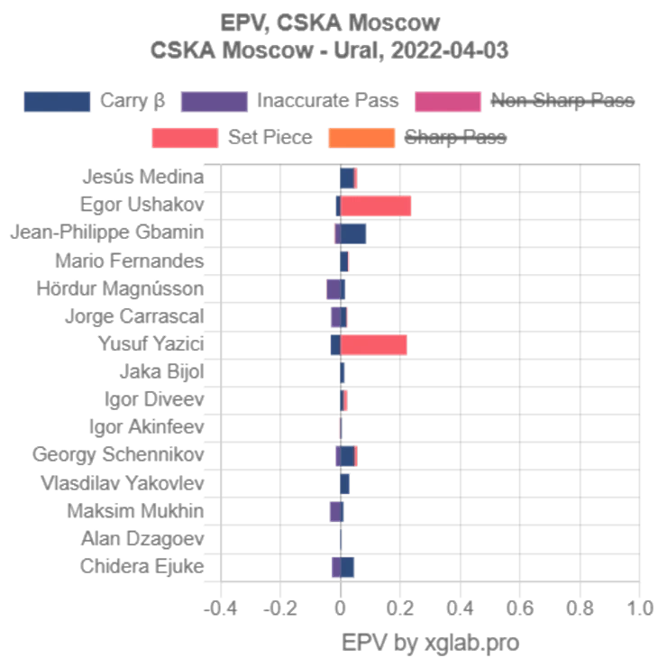 С первых минут второго тайма на поле появился Мухин. Теперь он составлял пару центральных полузащитников вместе с Гбаменом, а Медина перешёл на позицию левого латераля, вместо заменённого Щенникова. Такая перестановка точно принесла пользу – за спиной у игроков центра поля ЦСКА больше не возникало таких пространств за спиной. С выходом Яковлева, Дзагоева и Ушакова атакующие действия стали более конкретными: Яковлев занял место Языджи в центре нападения, а Юсуф получил более свободную роль, занимаясь поиском пространства на флангах. Мухин и Дзагоев тоже выдвигались выше, смещаясь в полуфланги. Армейцы стали больше нагружать штрафную площадь соперника, совершая кроссы. Во втором тайме таких было 18, против 10 в первом. Особо активны подавали в штрафную Ушаков и Языджи (5 и 8 кроссов соответственно) Всего по одному точному, но при этом они позволяли команде увеличивать «ценность владения». По показателю EPV они набрали 0.24 и 0.22 балла за счёт кроссов.