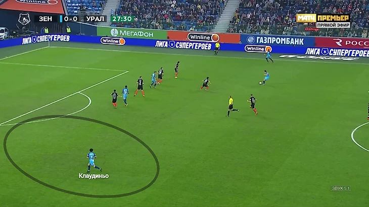 Поэтому благодаря быстрым переводам с одного фланга на другой «Зениту» удавалось вскрывать оборону «Урала», а в конце первого тайма хозяевам удавалось это ещё легче, ведь сказывалась усталость игроков, которые провели очень много времени в низком блоке, обороняясь почти всем составом на своей трети поля.