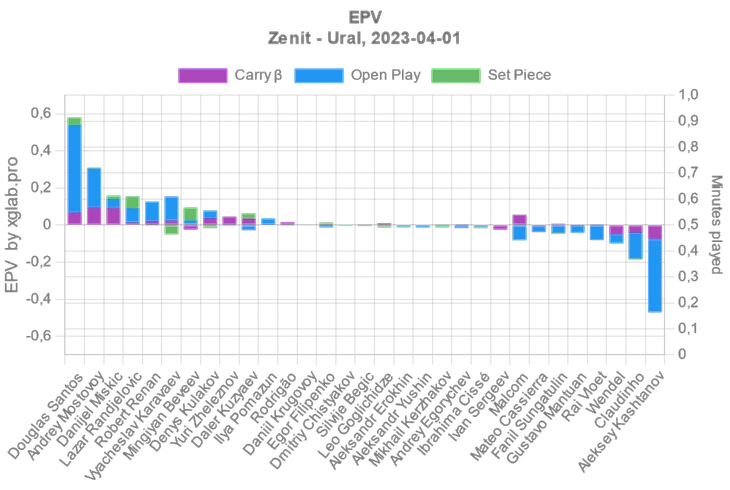 «Зенит» всё больше выигрывал подборы и быстрее возвращал себе мяч после каждой потери. Логично, что в такой ситуации указания Семака были просты – нужно было быстрее перемещать мяч с фланга на фланг и ждать, когда удастся создать численный перевес. Таким образом, хозяева наращивали своё давление, а оборона «Урала» находилась в постоянном напряжении и всё хуже справлялась со сдерживанием соперника. Почти всегда мяч доставлялся в чужую штрафную через зоны фланговых защитников, поэтому в таком сценарии хорошо показывал себя Дуглас Сантос. Бразилец в очередной раз стал лучшим по продвижению мяча (EPV).
