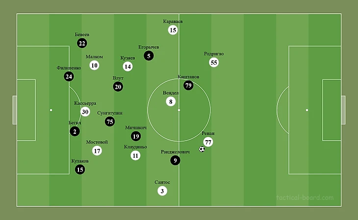 Поэтому логично, что Гончаренко таким образом подстраивался под соперника. Теперь при игре без мяча впереди часто оставались только Каштанов и Ранджелович, а игроки в центре сохраняли высокую компактность.