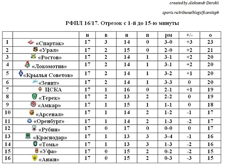 Удивительно хорошо выглядит в начале матчей «Урал» - две локальные победы (над «Уфой» и «Тереком») и ни одного поражения. «Спартак» добывал преимущество в стартовые минуты еще в начале сезона - над «Арсеналом», «Краснодаром» и «Оренбургом». В этот же список вполне могла попасть домашняя игра с «Крыльями», когда москвичи создали уйму моментов у ворот Лории. Плохо входят в игру футболисты «Краснодара», при этом в двух встречах из трех, когда они проигрывали по итогам 15 минут, краснодарцы уступали прямым конкурентам - «Спартаку» и «Ростову».