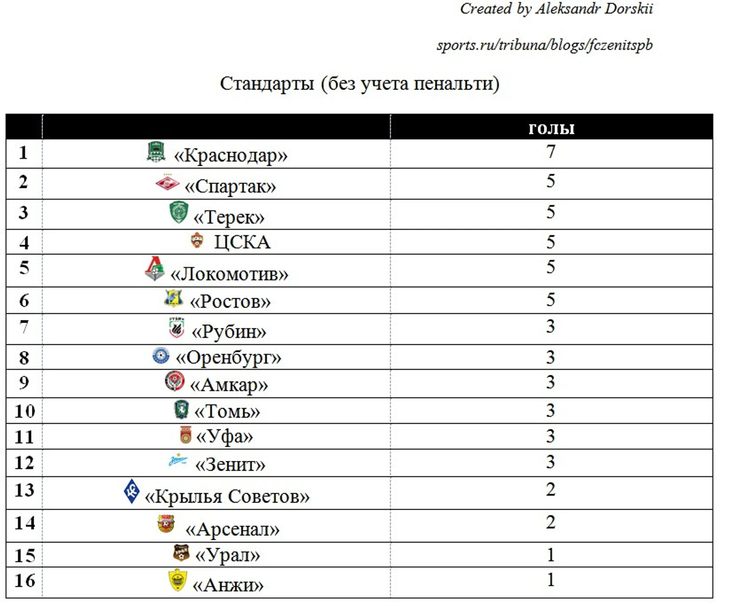 При Каррере «Спартак» существенно разнообразил розыгрыши стандартных положений, но пока это вылилось всего лишь в пять забитых мячей (10 – в сезоне 15/16). Высокие защитники «Краснодара» - одни из самых опасных игроков Лиги после подач с угловых (например, Мартынович после навеса с угла поля забил «Оренбургу»). «Зенит» и при Виллаш-Боаше испытывал большие трудности со стандартами (и это несмотря на наличие в составе Халка), при Луческу ситуация не улучшилась.