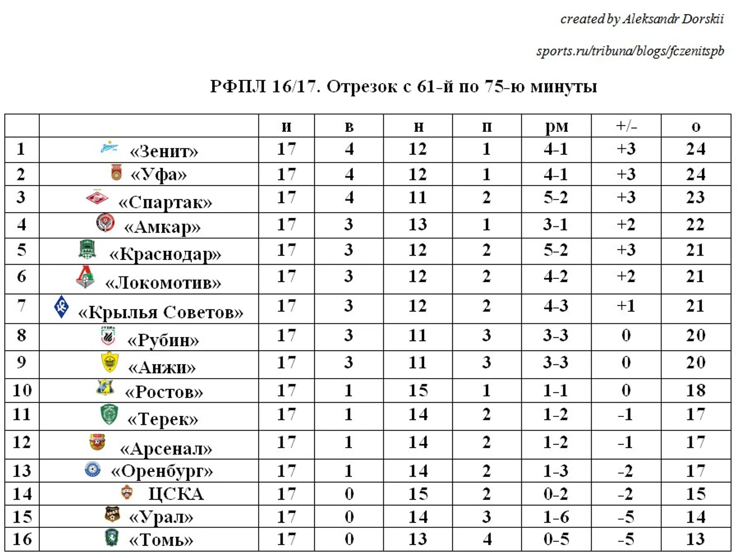 ЦСКА, и без того не слишком много забивающий, в середине вторых таймов ни разу не поразил ворота соперников. В отличие от «Уфы» (локальные победы над «Тереком, «Локо, «Томью и «Анжи»), которая имеет идентичные показатели с «Зенитом» («Ростов, «Арсенал, «Спартак, «Рубин»).