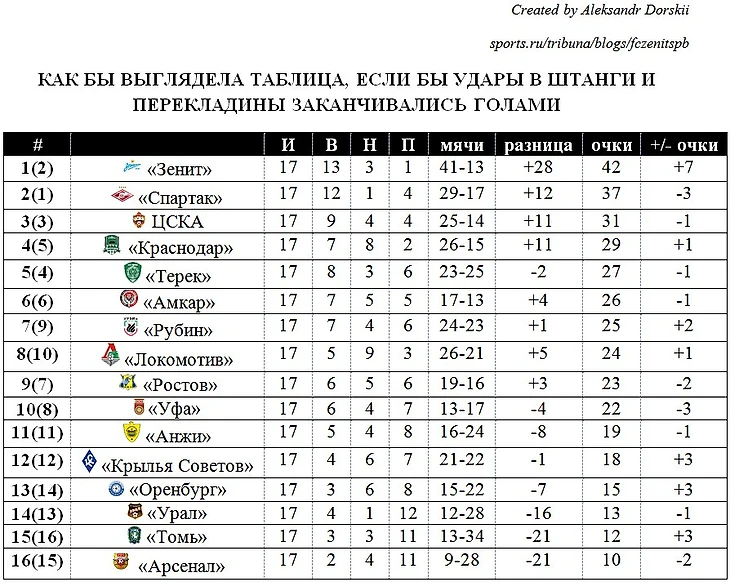 При теории о том, что все удары в штанги/перекладины заканчивались бы голами, ощутимое преимущество имел бы «Зенит». «Спартак» проиграл бы в Казани и сыграл бы вничью в Оренбурге, питерцы же, напротив, ушли бы от поражения в Грозном.
