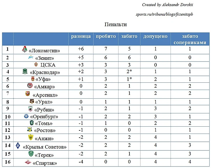 По общему количеству пробитых одиннадцатиметровых «Локомотив» опережает «Зенит», но по числу забитых москвичи занимают лишь вторую позицию – Самедов и Пейчинович по одной из своих попыток не реализовали. У петербуржцев штатного пенальтиста нет - Кришито и Жулиано пробивали по два раза, Дзюба и Кержаков - по разу.