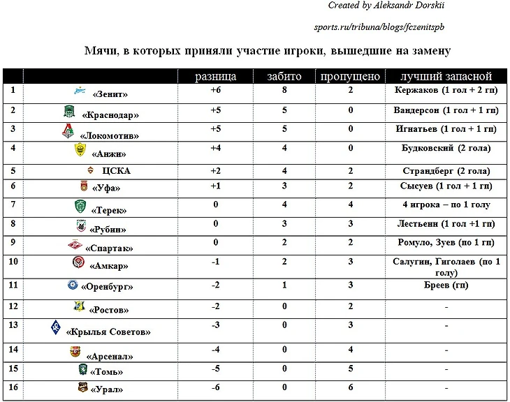 Результаты «Зенита» и «Краснодара» намного более равномерны. Вандерсон стал самым результативным запасным краснодарцев даже несмотря на серьезную травму, но куда больше запомнился выход Окриашвили в ноябрьском матче с командой Луческу.
